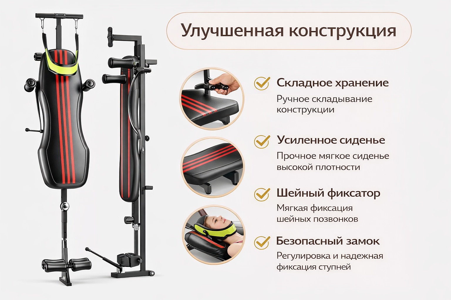 УправлениемеханическоеМаксимальный вес пользователя150 кгМаксимальный уровень отклонения1 град.Материалпластик, сталь, искусственная кожа, ПВХОсобенностирегулировка по росту, прорезиненные углы и ручки, складная конструкцияЦветчерныйМаксимальный рост пользователя195 cmРазмеры140-200Вес12 кгДополнительная информацияИнверсионный стол — надёжный тренажёр для снятия боли в спине и вытяжения позвоночника. Подходит для дома, прост в использовании, регулируется под рост и вес. Отличный выбор для профилактики и восстановления.